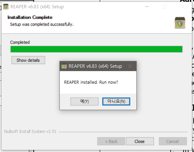 7. 설치 과정이 끝나길 기다린 후, Close 단추를 누른다. 다시, 바로 프로그램을 시작할 지 묻는데, 여기서는 No를 선택한다.