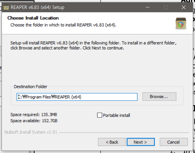 Note: If you are installing REAPER for the first time, or if you wish to replace an installed version of REAPER, you should not enable Portable install. If you wish to install this alongside an existing installed version (such as 5.xx), then you should change the destination folder (e.g. to \REAPER6) and enable Portable install. This will ensure that your existing settings and preferences will be preserved separately.