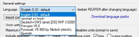다른 언어 팩을 설치하려면 Download language packs 링크를 클릭한다. 리퍼 언어 팩 URL로 연결될 것이다 (불행히도 한국어 언어 팩은 아직 없다). 언어 팩을 선택해서 다운로드 한 후, Preferences 윈도우를 닫고 Options > Show REAPER resource path in Explorer/Finder 명령을 이용해서 리퍼의 리소스 폴더를 연다. 그리고는 다운로드 받은 언어 팩 파일(들)을 이 폴더에 넣는다. 특정 언어 팩을 선택하려면, Preferences 윈도우의 General 페이지에 있는 목록 상자에서 선택한다. 새 언어를 적용하려면 리퍼를 다시 시작해야 한다.