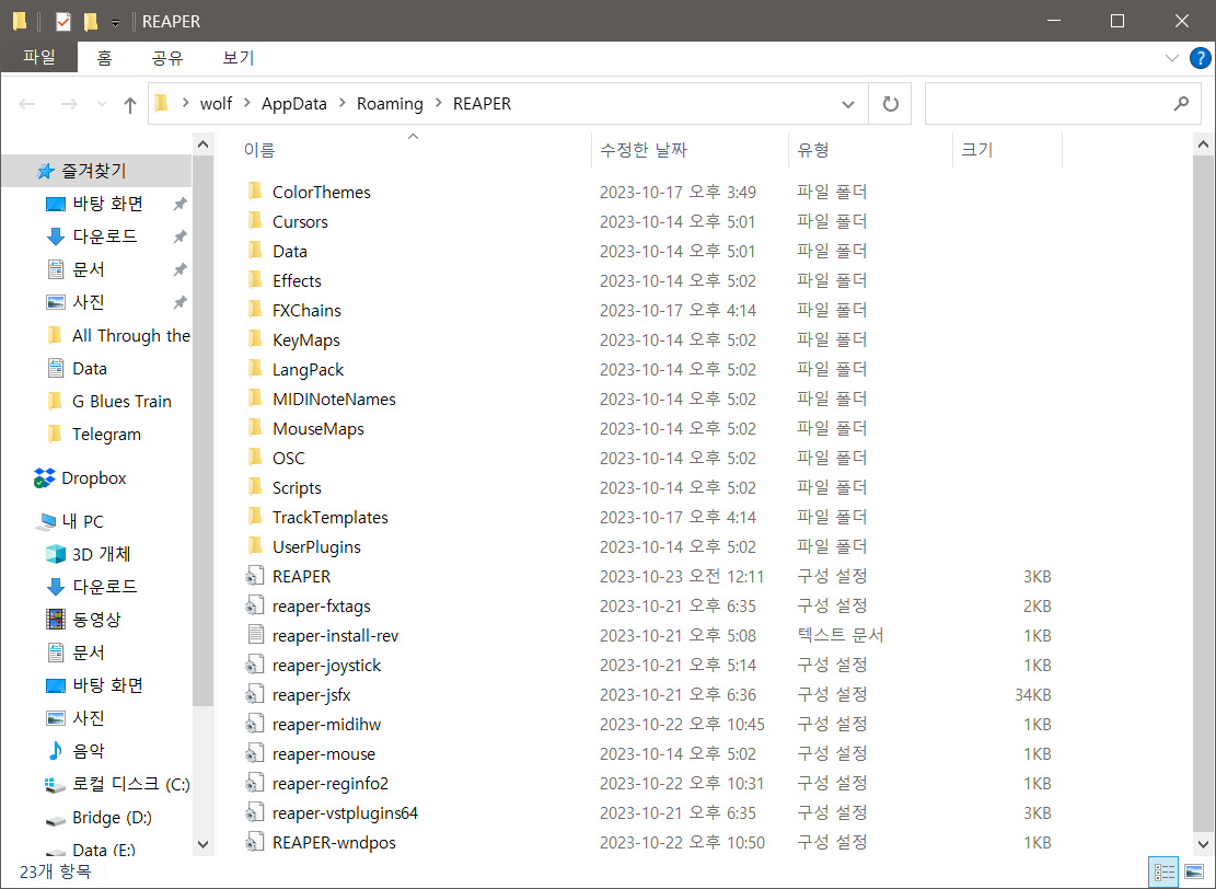 6. REAPER.ini: 모든 옵션, 설정, 마지막으로 사용한 스크린 레이아웃 등, 최근 사용한 프로젝트 히스토리 등의 정보가 저장된다.