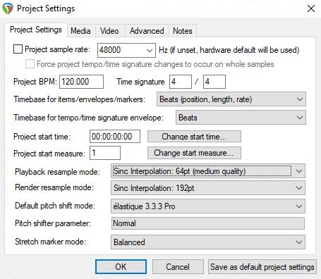 프로젝트의 타임 베이스란 프로젝트 템포를 변경할 때 미디어, 파형, 마커 등이 어떻게 변할지를 조절한다. 가급적, 뭔가 녹음하거나 오디오를 불러들이기 전에 미리 프로젝트 타임 베이스를 맞게 설정해두는 것이 좋다.