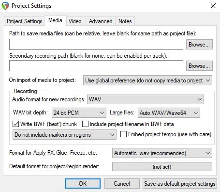 ● Primary and secondary Paths to store media files. For example, if you specify “Media” then your media will be stored in a folder called Media, as a sub-folder of the project folder. If left blank, REAPER will use the project file folder.