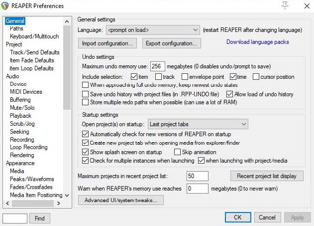 To open an existing REAPER Project File, use the File > Open Project command, or the keyboard shortcut Ctrl + O. Recently used projects can more easily be opened using the File > Recent Projects command. This causes a list of up to the last 100 recently used project files to be displayed. The General page of your Options > Preferences window offers a number of options. In particular, you can: