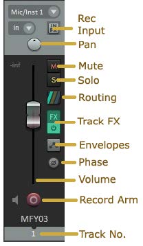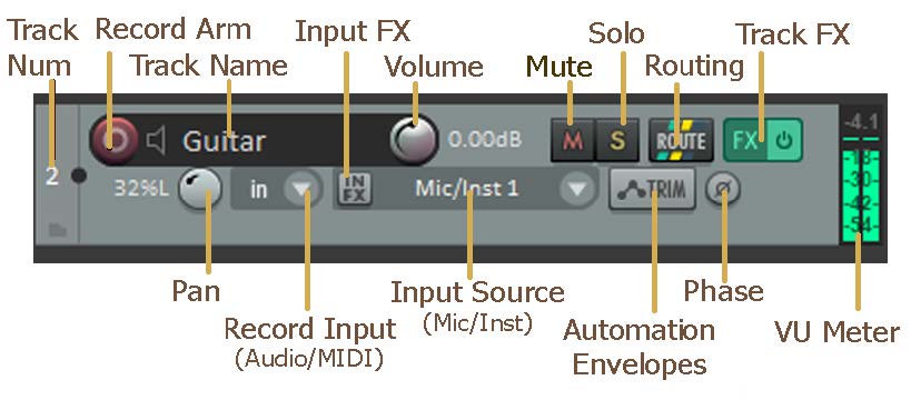 The illustration below shows REAPER's track controls. Which faders are visible and their exact position in the track panel may vary according to factors such as the REAPER’s theme, the track layout, the track height and the track control panel width and whether the Arrange View and the Mixer are shown or not.
