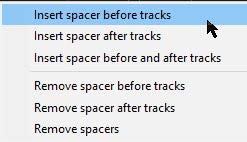 To add or remove the spacer, right clicking over a track’s track panel and choosing Visual spacer from the context menu. Options are to add a spacer before or after the track, or both, or to remove existing spacers. To add a spacer after or before a number of adjacent tracks, simply select all of the required tracks and right click over any one of their track panels, choose Visual spacer from the menu, then make your selection as before.