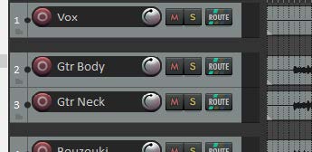 Shown left are a vocal track and two guitar tracks. A spacer has been inserted above the first and after the second guitar track to visually separate them from the other tracks.