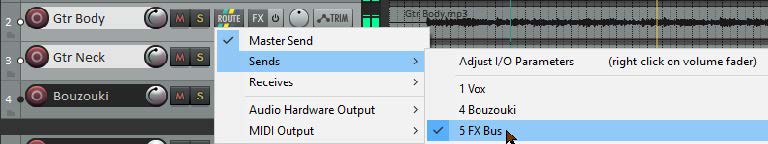 3. Display the routing window for either guitar track and adjust the send levels for that track.