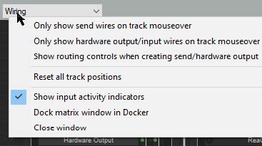 Track Wiring is accessed directly from the View menu. Let’s start with a simple example. You can use the dropdown list in the top left corner of window to switch between any of the four listed view modes which are routing matrix, wiring, track grouping matrix, and region render matrix. This can be especially useful for switching between the track wiring diagram and the routing matrix.