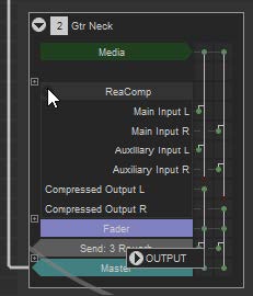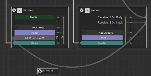 그림에서 Gtr Neck 트랙에는 미디어 항목이 있으며, ReaComp라는 하나의 FX, Reverb 트랙으로 보내지는 샌드와 마스터로 보내지는 샌드가 있다. 두 개의 채널을 사용하므로 두 개의 세로 선이 오른쪽에 표시된다. Reverb 트랙은 미디어 항목은 없으며, 트랙 1과 2로부터의 수신, ReaVerbate라는 FX, 그리고 마스터로 보내지는 출력이 표시되어 있다.