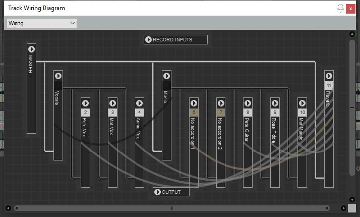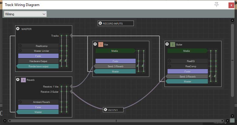 Above you see the track wiring view for a project with two recorded tracks and one reverb track.