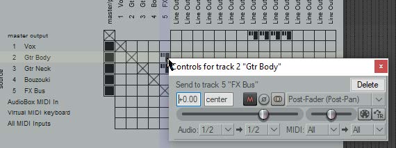 Alt + R 단축키를 누르면 라우팅 매트릭스가 표시된다. 예를 들어 All Through The Night with Bus 프로젝트라면 그림과 비슷한 창이 열릴 것이다. 가운데 매트릭스에서 Gtr Body 행(가로)이 FX Bus 열(세로)과 만나는 격자를 보면 작은 얼룩 같은 것이 표시되어 있다. 그 격자를 왼쪽 또는 오른쪽 클릭하면, Gtr Body 트랙의 신호를 FX Bus 트랙으로 보낼 때 조절할 수 있는 컨트롤들이 표시된 창을 열 수 있다.