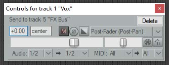 트랙 상자 안의 Send로 시작하는 항목을 클릭하면 해당 샌드의 조절 창이 열려서, 샌드 유형을 바꾸거나 음량/팬 등을 조절하거나, 보내는 채널을 변경하거나, 해당 샌드를 지울 수도 있다.