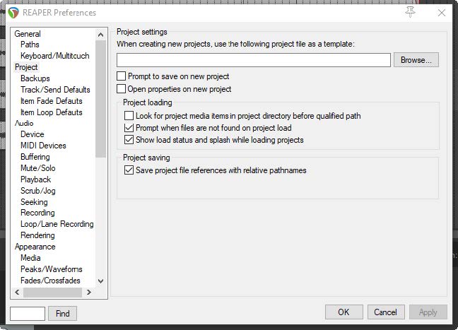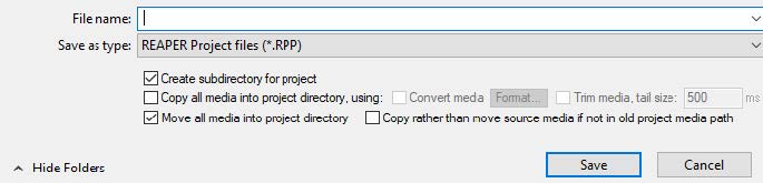 Create subdirectory for project 옵션으로 하위 디렉토리를 만들 수 있다. Copy all media into project directory 옵션으로 사용된 미디어 파일들을 프로젝트 디렉토리로 복사하고, 이 때 복사하면서 변환시킬 포멧을 지정할 수 있다. Move all media into project directory 옵션을 선택하면 기본적으로 프로젝트에서 사용된 모든 미디어 파일들이 프로젝트 디렉토리로 옮겨진다. 그 옆의 Copy rather than move source media if not in old project media path 옵션을 선택할 수도 있다. 예를 들어 프로젝트에서 샘플 라이브러리의 미디어 파일들을 이용하는 경우, 라이브러리에서 해당 파일을 지우길 원치 않을테니 이럴 경우 사용한다.