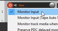 - 기본 설정으로 입력 모니터링이 켜질 것이다. 레코드 암 단추 위에서 마우스 우클릭해서 나타나는 컨텍스트 메뉴의 첫 번째 항목이 Monitor Input 옵션이다. 만약 가지고 있는 사운드 카드가 다이렉트 모니터링 기능을 지원한다면 보통은 그 기능을 이용하고 싶을 것이다. 그런 경우에는 리퍼의 입력 모니터링 옵션을 꺼줘야 한다. 사운드 카드의 문서를 확인해보라. 사운드 카드가 다이렉트 모니터링을 지원하지 않는다면 리퍼의 입력 모니터링 옵션을 켜둬야 한다.