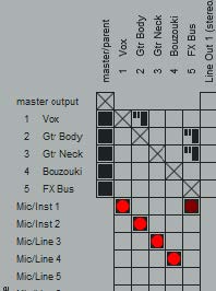 - Click in the appropriate cells in the Routing Matrix to assign each track to a different input. The example shown uses audio inputs - Input 1 is to go to Track 1, Input 2 to Track 2 and so on. MIDI inputs may also be selected – these are listed below the audio inputs. You can also right click over any red cell to access the Record Input menu should you wish to do so.