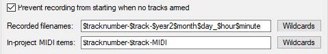 녹음을 시작하기 전에 먼저 트랙 이름을 지정하는 것이 좋다. 트랙 이름 영역을 더블클릭하고 이름을 입력하고 엔터 키를 누른다. 이렇게 하면 녹음할 때 생기는 미디어 파일들이 트랙 이름에 맞춰 생성된다. Options > Preferences > Audio 항목 아래에 Recording 설정 페이지에서 트랙 관련 파일 이름에 자동으로 포함시킬 와일드카드 목록을 선택할 수 있다. 예를 들어 트랙 번호, 녹음 날자와 시간 등을 포함시킬 수 있다.