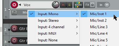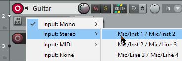 - Click the mouse over the Input settings for that track to display a menu. Menu options will be determined by your sound card and audio device(s).